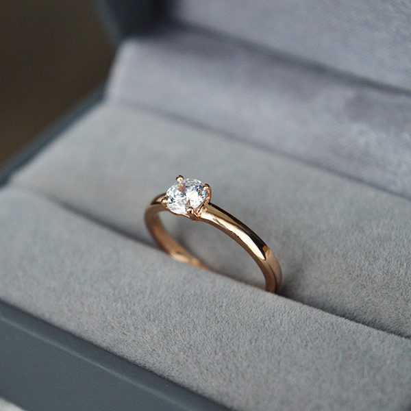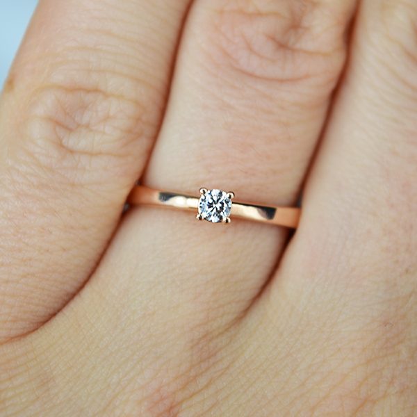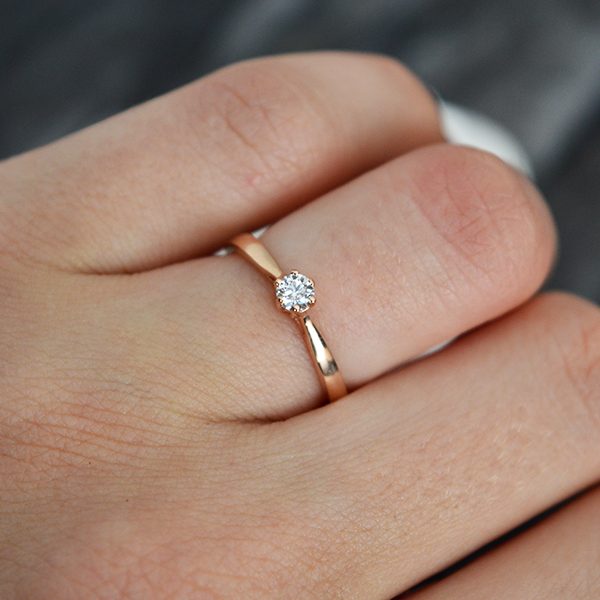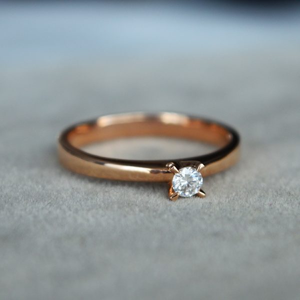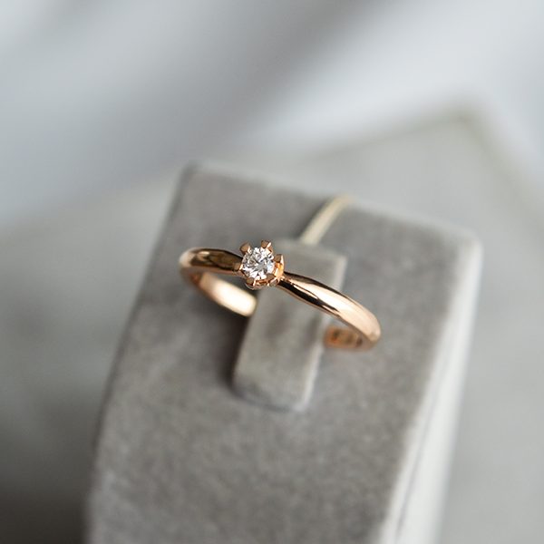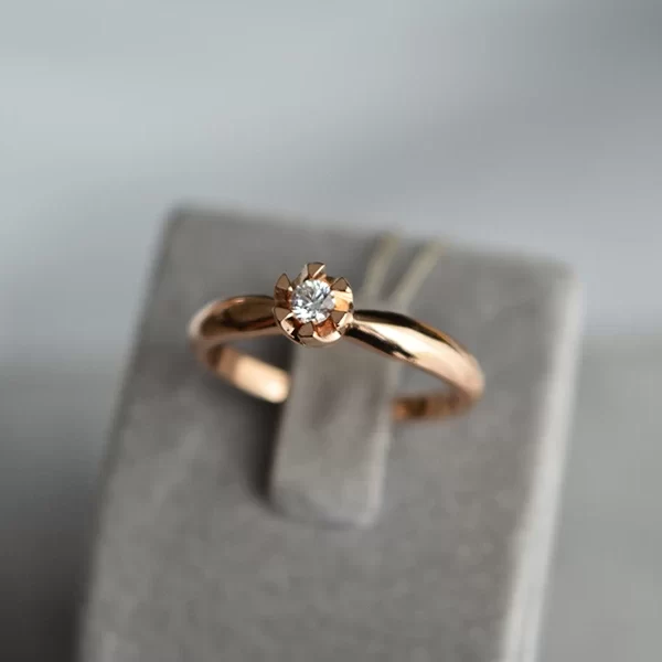 Sužadėtuvių žiedas, inkrustuotas aukštos kokybės deimantu, juvelyro rankų darbo. Deimantas turi kokybę patvirtinantį sertifikatą. Pagamintas iš raudono aukso.
