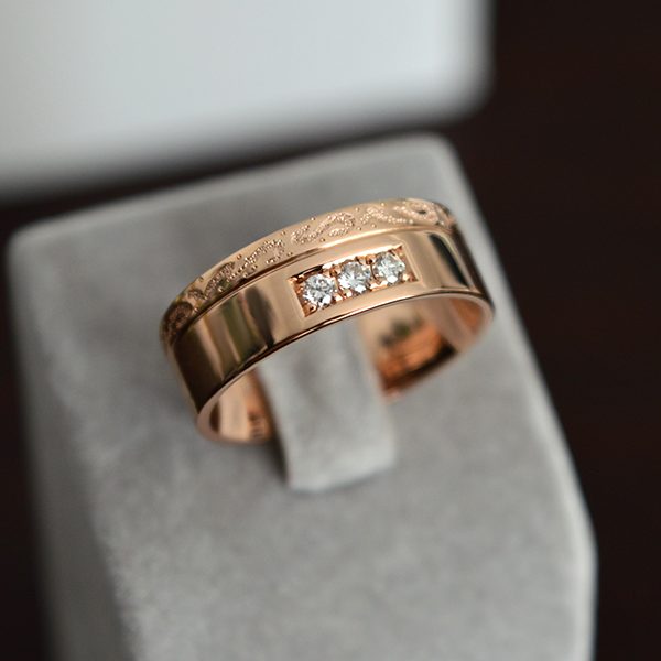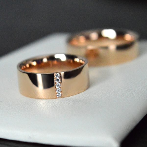 Nuotraukoje pavaizduoti žiedai yra 7 mm pločio su 3 vnt. deimantų, viso ~ 0.1 ct. Pagaminti iš raudono aukso.