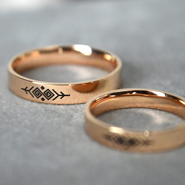 Rankų darbo vestuviniai žiedai, graviruoti lazeriu (nuotraukoje graviravimo pavyzdys – norimą simbolį galima pasirinkti individualiai). Su komforto zona. Gamybos kaina apskaičiuojama individualiai pagal Jūsų matmenis.