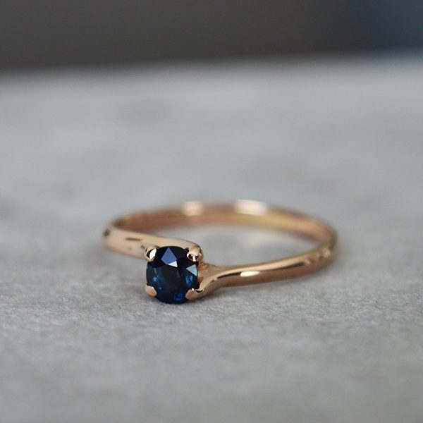 Sužadėtuvių žiedas, inkrustuotas aukštos kokybės safyru, juvelyro rankų darbo. Safyras turi kokybę patvirtinantį sertifikatą. Pagamintas iš raudono aukso.