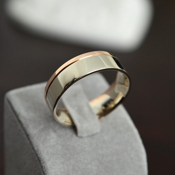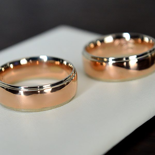 Nuotraukoje pavaizduoti žiedai yra 6 mm pločio. Pagaminti iš raudono ir balto aukso.