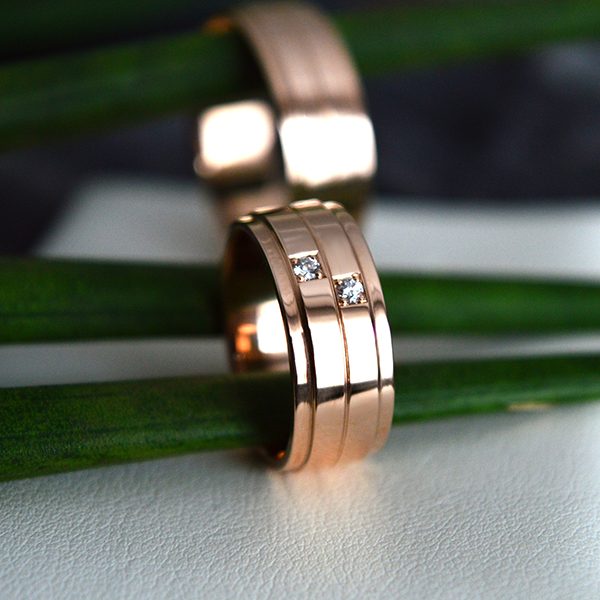 Nuotraukoje pavaizduoti žiedai yra 8 mm pločio su 2 vnt. briliantų po 2 mm, viso ~ 0.07 ct. Pagaminti iš raudono aukso.