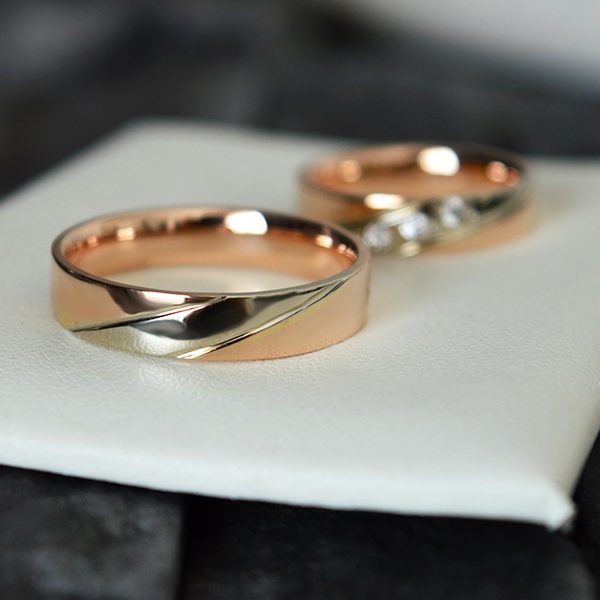 Nuotraukoje pavaizduoti žiedai yra 5 mm pločio. Vienas žiedas yra su 3 vnt. briliantų po 1.8 mm, viso ~ 0.07 ct. Pagaminti iš raudono ir balto aukso.