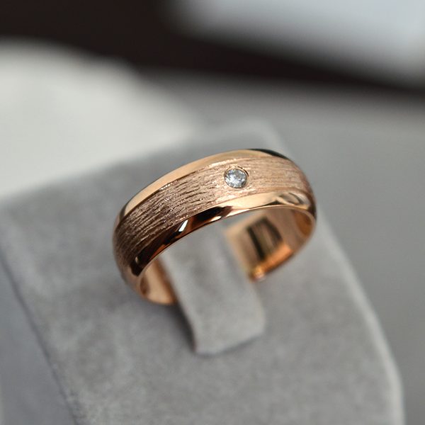 Nuotraukoje pavaizduoti žiedai yra 6 mm pločio su 1 vnt. briliantų, viso ~ 0.03 ct. Pagaminti iš raudono aukso.