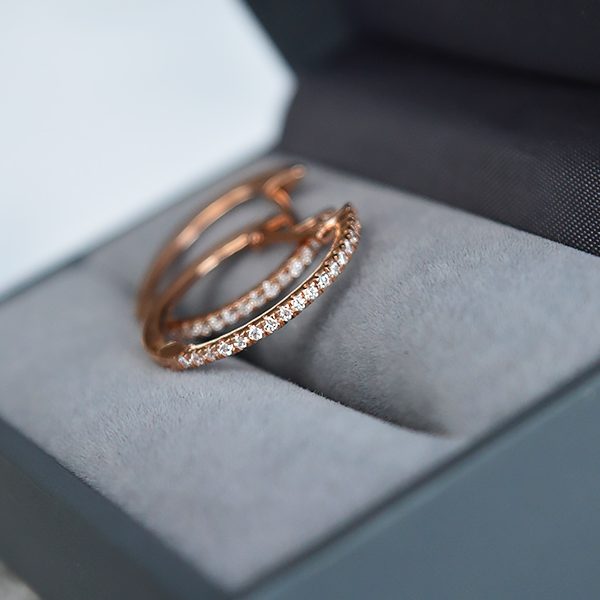 Raudono aukso auskarai – rinkės su briliantais. Aukštos kokybės, skaidrūs briliantai yra su sertifikatais.