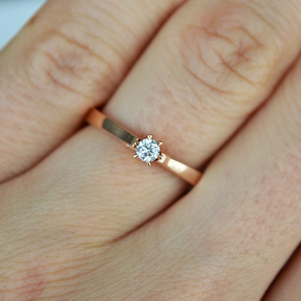 Sužadėtuvių žiedas, inkrustuotas aukštos kokybės deimantu, juvelyro rankų darbo. Deimantas turi kokybę patvirtinantį sertifikatą. Pagamintas iš raudono aukso.