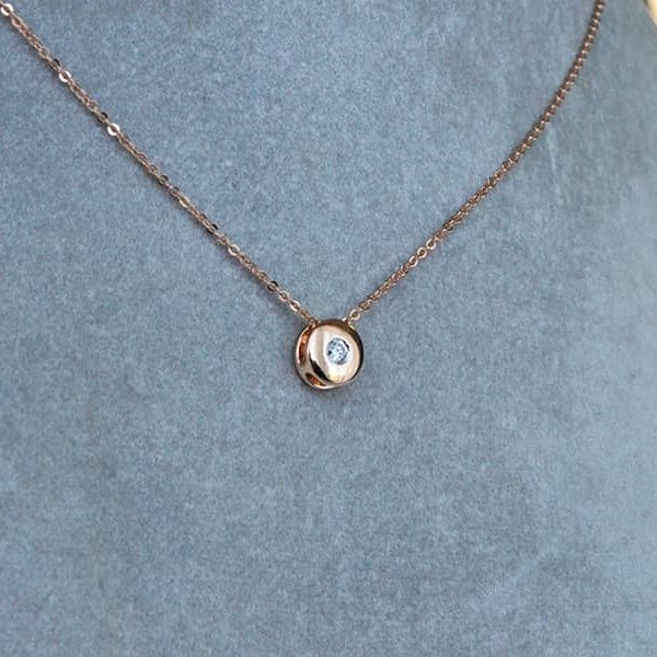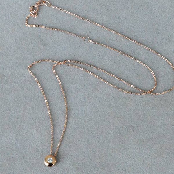 Auksinė grandinėlė su deimanto pakabuku. Aukštos kokybės deimantas yra su kokybę patvirtinančiu sertifikatu. Pagaminta iš raudono aukso.