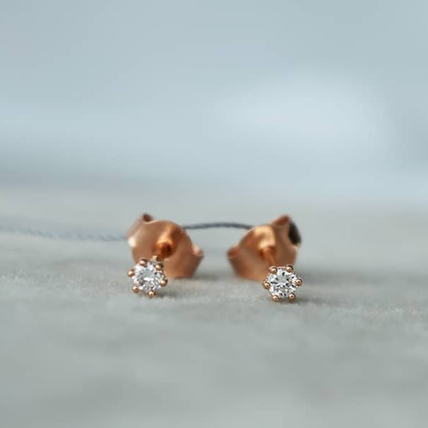 Auskarai su deimantais, pagaminti iš raudono aukso. Aukštos kokybės deimantai yra su kokybę patvirtinančiu sertifikatu. Juvelyrų rankų darbo.
