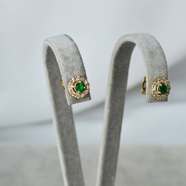 Auskarai su deimantais ir smaragdais, pagaminti iš geltono aukso. Aukštos kokybės deimantai bei smaragdai turi kokybę patvirtinantį sertifikatą.