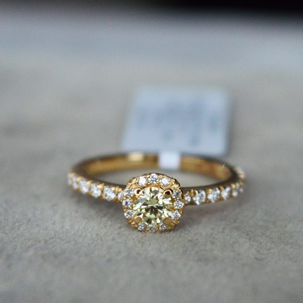 Auksinis žiedas, inkrustuotas deimantais, juvelyro rankų darbo. Deimantai turi kokybę patvirtinantį sertifikatą. Pagamintas iš geltono aukso.