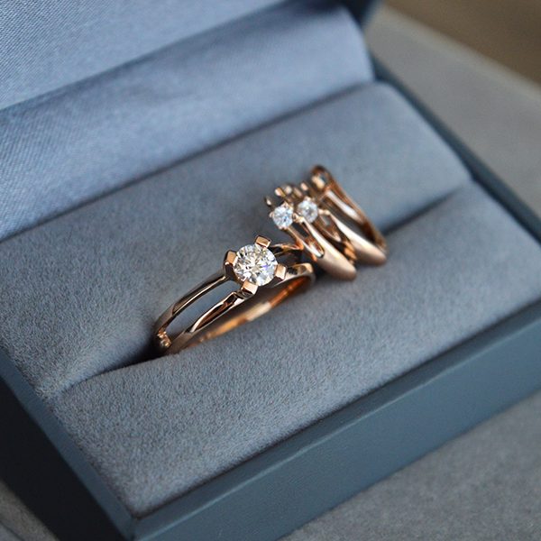 Auksinis žiedas, inkrustuotas aukštos kokybės deimantu, juvelyro rankų darbo. Deimantas turi kokybę patvirtinantį sertifikatą. Pagamintas iš raudono aukso.