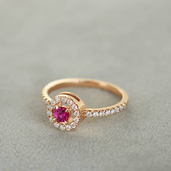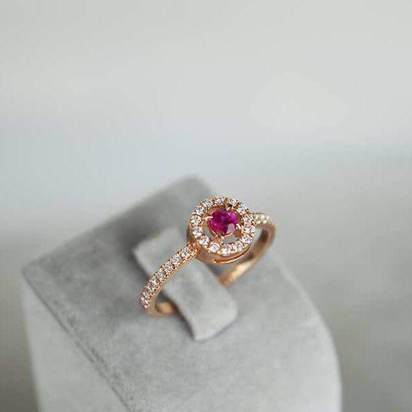 Rankų darbo auksinis žiedas su aukštos kokybės deimantais ir rubinu, pagamintas iš raudono aukso. Kiekvienas akmuo yra kruopščiai inkrustuotas juvelyro rankomis. Deimantai bei rubinas turi kokybę patvirtinantį sertifikatą.