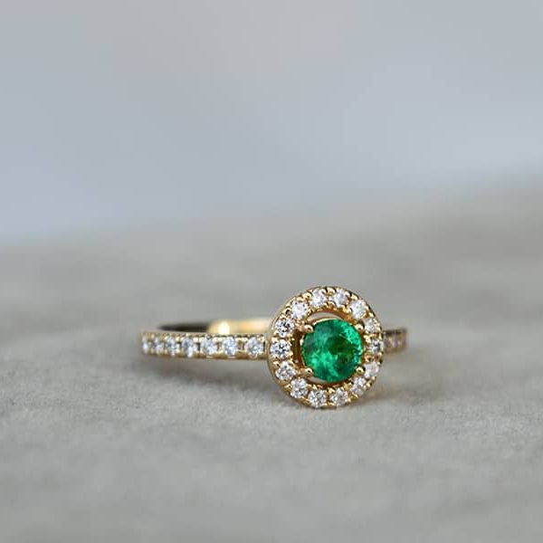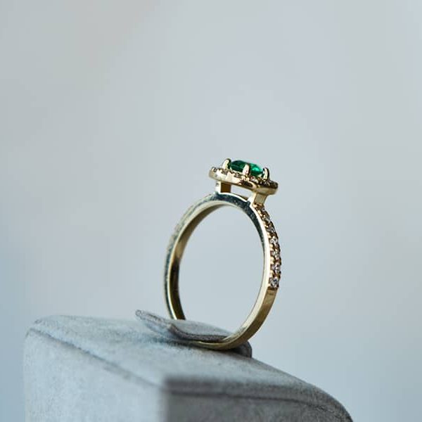 Rankų darbo žiedas su aukštos kokybės deimantais bei smaragdu. Aukštos kokybės deimantai ir smaragdas yra su sertifikatu. Pagamintas iš geltono aukso.