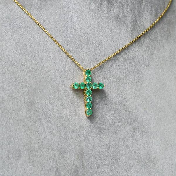 Juvelyro rankų darbo auksinis kryželis su aukštos kokybės smaragdais. Smaragdai yra su kokybę patvirtinančiu sertifikatu. Pakabukas ir grandinėlė pagaminti iš geltono aukso.