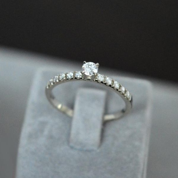 Sužadėtuvių žiedas, inkrustuotas aukštos kokybės deimantais, juvelyro rankų darbo. Deimantai turi kokybę patvirtinantį sertifikatą. Pagamintas iš balto aukso.