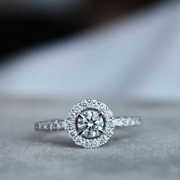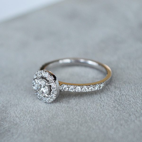 Rankų darbo sužadėtuvių žiedas su aukštos kokybės deimantais. Centrinis deimantas yra su tarptautiniu GIA sertifikatu. Pagamintas iš balto aukso.