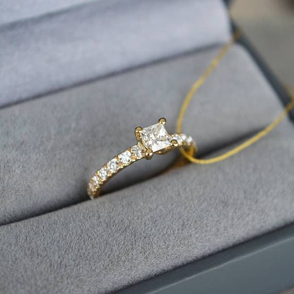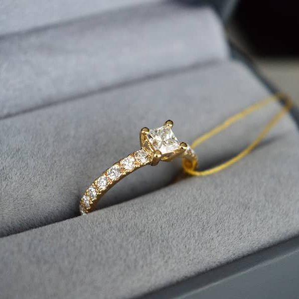Sužadėtuvių žiedas, inkrustuotas aukštos kokybės deimantais, juvelyro rankų darbo. Centrinis „Princess cut” deimantas turi tarptautinį GIA sertifikatą. Pagamintas iš geltono aukso.