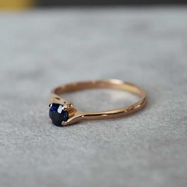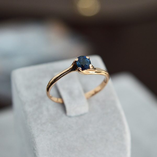 Sužadėtuvių žiedas, inkrustuotas aukštos kokybės safyru, juvelyro rankų darbo. Safyras turi kokybę patvirtinantį sertifikatą. Pagamintas iš raudono aukso.