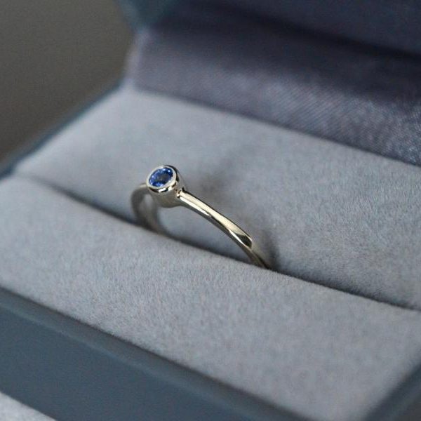 Sužadėtuvių žiedas, inkrustuotas aukštos kokybės safyru, juvelyro rankų darbo. Safyras turi kokybę patvirtinantį sertifikatą. Pagamintas iš balto aukso.