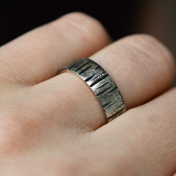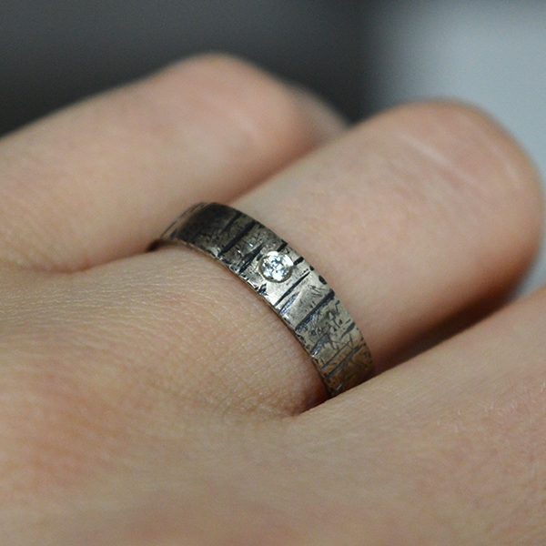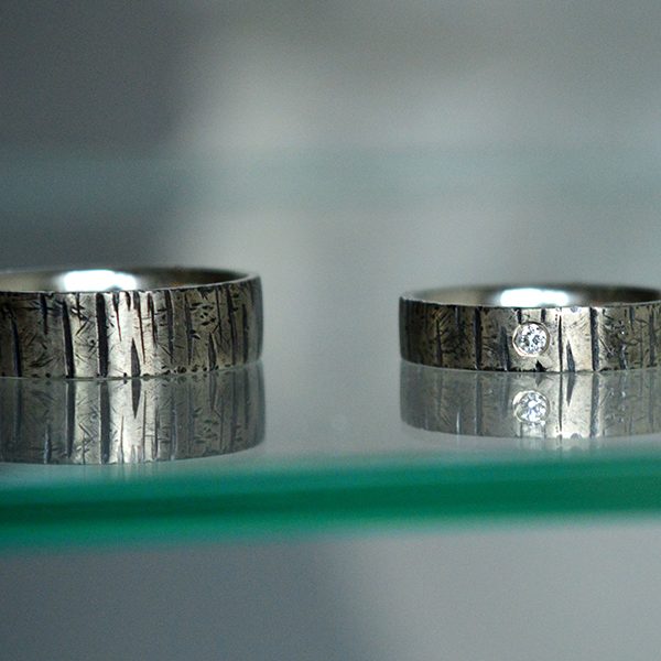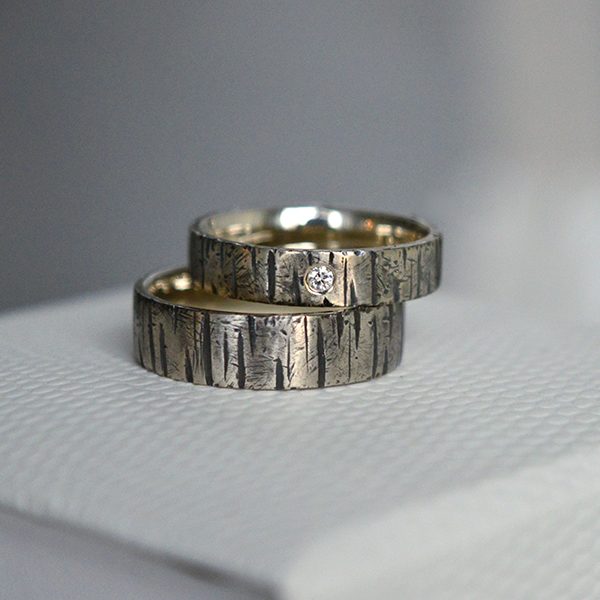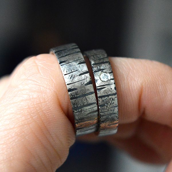 Rankų darbo vestuviniai žiedai sendinto stiliaus paviršiumi su komforto zona, dengti juodu rodžiu su aukštos kokybės deimantais (galimi ir kiti akmenys). Gamybos kaina apskaičiuojama individualiai pagal Jūsų matmenis.