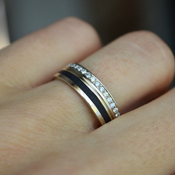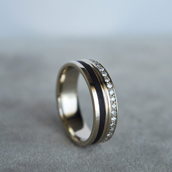 Nuotraukoje pavaizduoti žiedai yra 6 mm pločio su 30 vnt. briliantų, viso ~ 0.75 ct. Pagaminti iš balto aukso bei titano.