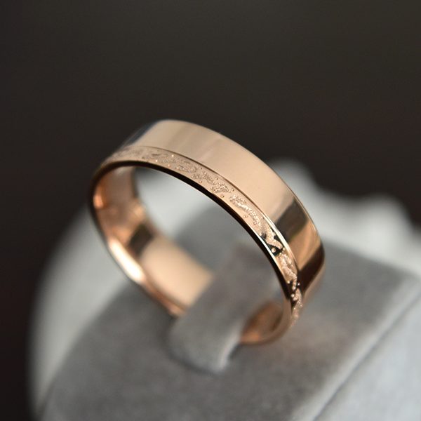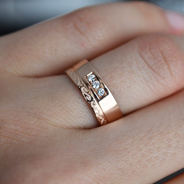 Nuotraukoje pavaizduoti žiedai yra 7 mm pločio su 3 vnt. deimantų, viso ~ 0.1 ct. Pagaminti iš raudono aukso.