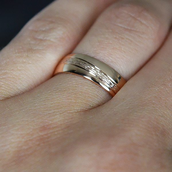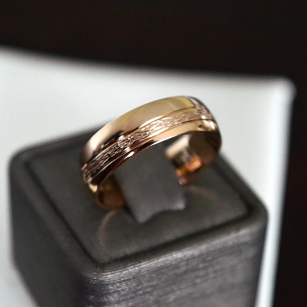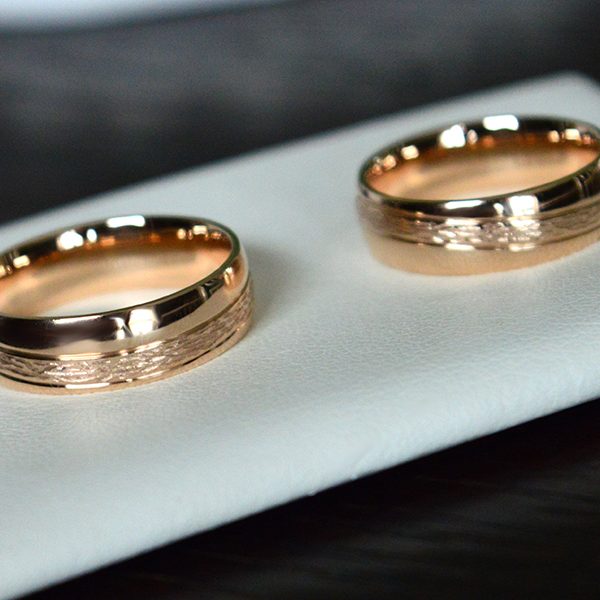 Nuotraukoje pavaizduoti žiedai yra 6 mm pločio, pagaminti iš raudono aukso.
