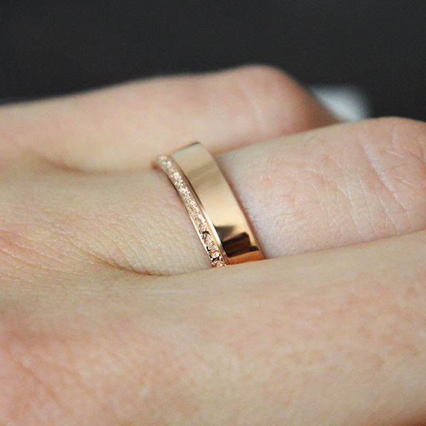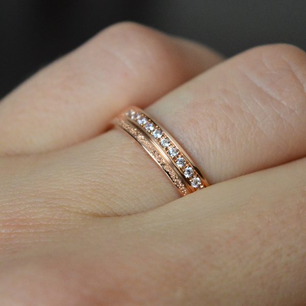 Nuotraukoje pavaizduoti žiedai yra 4 ir 5 mm pločio su 10 vnt. deimantų po 1 mm, viso 0.05 ct. Pagaminti iš raudono aukso.