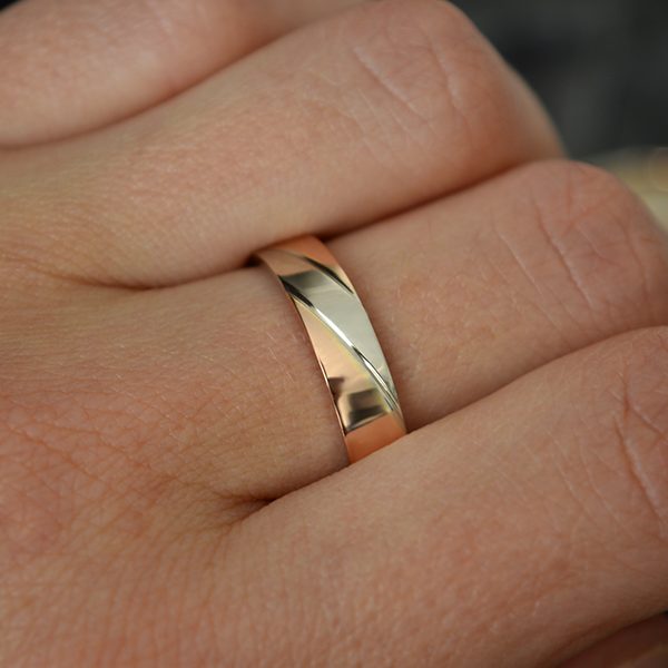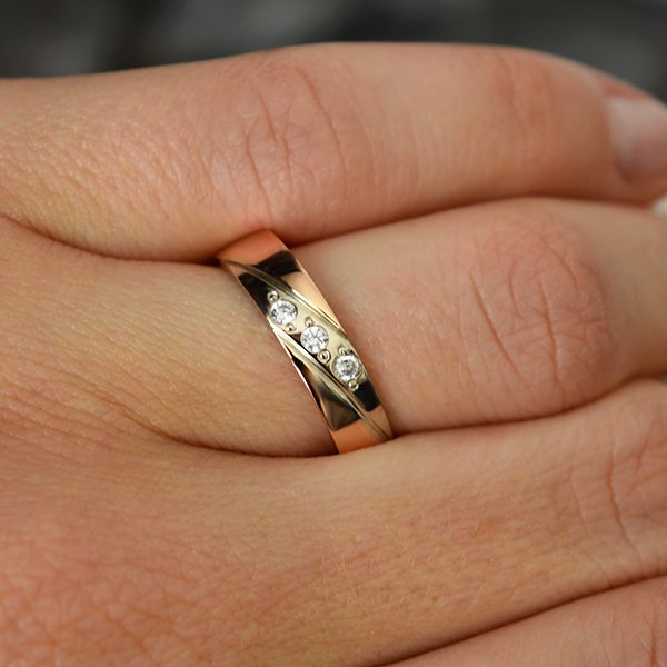 Nuotraukoje pavaizduoti žiedai yra 5 mm pločio. Vienas žiedas yra su 3 vnt. briliantų po 1.8 mm, viso ~ 0.07 ct. Pagaminti iš raudono ir balto aukso.