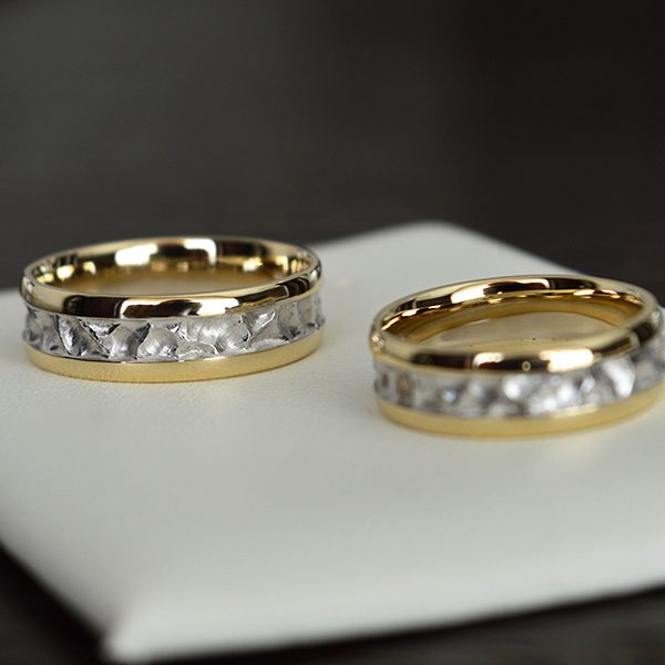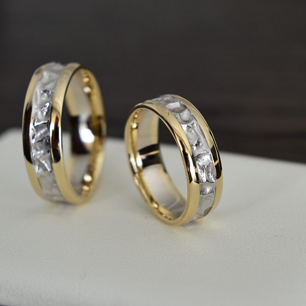 Rankų darbo vestuviniai žiedai nelygiu paviršiumi, dviejų aukso spalvų. Su komforto zona. Gamybos kaina apskaičiuojama individualiai pagal Jūsų matmenis.