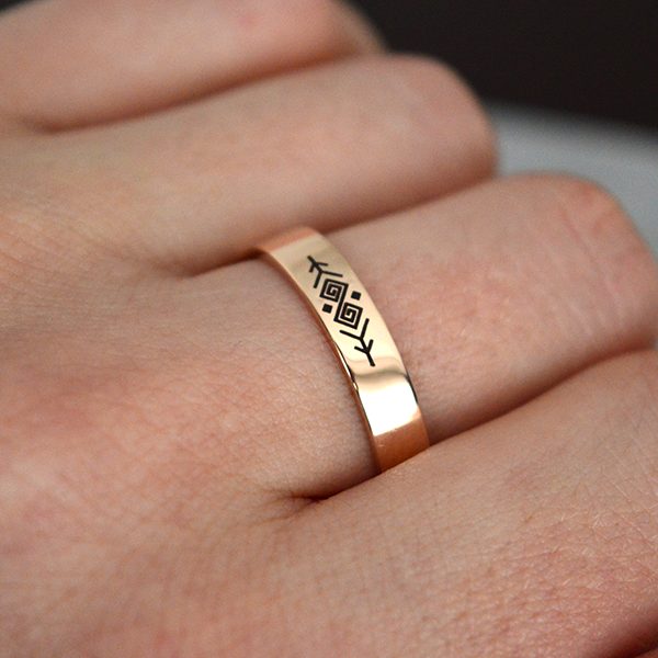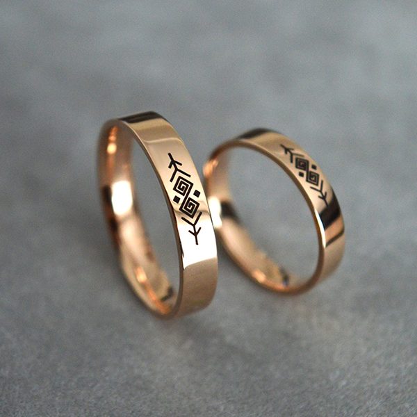 Rankų darbo vestuviniai žiedai, graviruoti lazeriu (nuotraukoje graviravimo pavyzdys – norimą simbolį galima pasirinkti individualiai). Su komforto zona. Gamybos kaina apskaičiuojama individualiai pagal Jūsų matmenis.