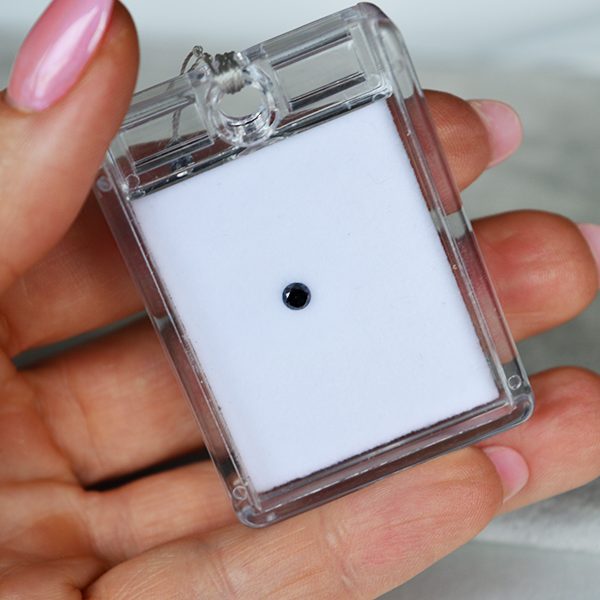 Natūralus, juodos spalvos deimantas dėžutėje.